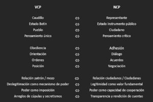 De ahí que esta “Vieja Cultura Política” (VCP) no es más que el tratamiento post colonial de los asuntos públicos o bien una cultura política postcolonial. Esta política se ha contrapuesto a una “Nueva Cultura Política” (NCP) que implique el tratamiento de los asuntos públicos en el marco de derechos ciudadanos. Podemos reconocer algunos elementos políticos que difieren de un modelo a otro y que han ido siendo señalados a lo largo de los últimos años: