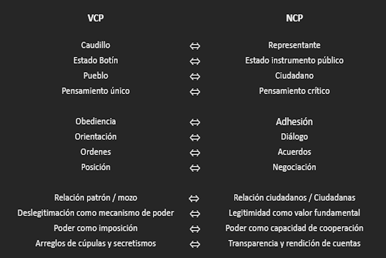 De ahí que esta “Vieja Cultura Política” (VCP) no es más que el tratamiento post colonial de los asuntos públicos o bien una cultura política postcolonial. Esta política se ha contrapuesto a una “Nueva Cultura Política” (NCP) que implique el tratamiento de los asuntos públicos en el marco de derechos ciudadanos. Podemos reconocer algunos elementos políticos que difieren de un modelo a otro y que han ido siendo señalados a lo largo de los últimos años:
